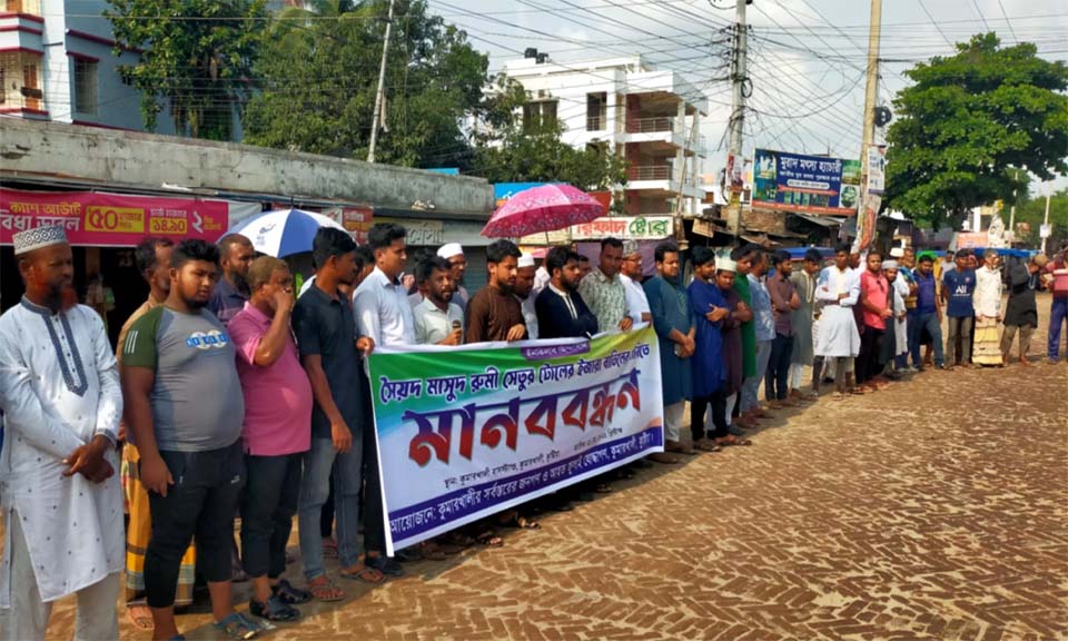কুষ্টিয়া-রাজবাড়ী সড়কের কুমারখালীতে গড়াই নদীর ওপর নির্মিত সৈয়দ মাসউদ রুমী সেতুর টোল আদায় বন্ধের দাবিতে মানববন্ধন অনু্ষ্িঠত হয়েছে। বুধবার (২১ মে) বিকাল সাড়ে ৩ টায় কুমারখালী বাসস্টান্ড সংলগ্ন গোলচত্বর এলাকায় মানববন্ধনের আয়োজন করেন সর্বস্তরের জনগণ ও আহত জুলাই যোদ্ধাগণ।