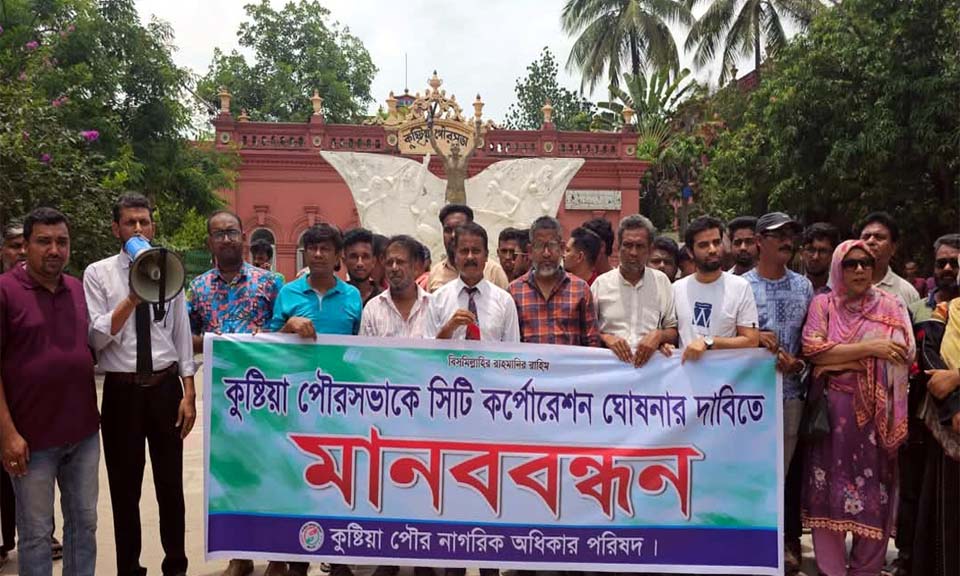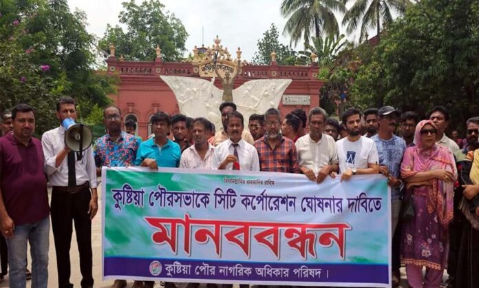 কুষ্টিয়া পৌরসভাকে সিটি কর্পোরেশনে রূপান্তরিত করার দাবিতে মানববন্ধন করেছে পৌর নাগরিক অধিকার পরিষদ।