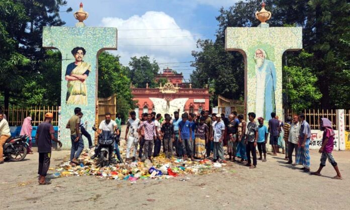কুষ্টিয়া পৌরসভার গেটে ময়লা ফেলে পরিচ্ছন্নতা কর্মীরা কর্মবিরতি পালন করেছেন।