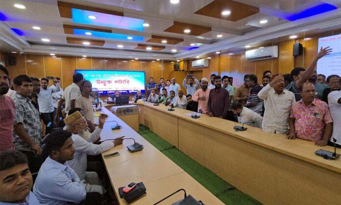 এরপরই জেলা প্রশাসকের কনফারেন্স রুমে উপস্থিত বিএনপি এবং জামায়াতের সমর্থকরা হট্টগোল শুরু করেন এবং বিভিন্ন ¯েøাগান দিতে দিতে বের হয়ে সম্মেলন কক্ষের দরজার বাইরে দাঁড়িয়ে সেখানে বিভিন্ন ¯েøাগান দেয়া শুরু করলে জেলা প্রশাসক মো: তৌফিকুর রহমান মাইক্রোফোন নিয়ে তাদেরকে বোঝানোর চেষ্টা করেন। কিন্তু হট্টগোলকারীরা এতে কর্ণপাত না করে বিক্ষোভ প্রদর্শন করতে থাকলে তিনি কার্যক্রম বন্ধ ঘোষণা করে তার অফিস কক্ষের দিকে চলে যান।