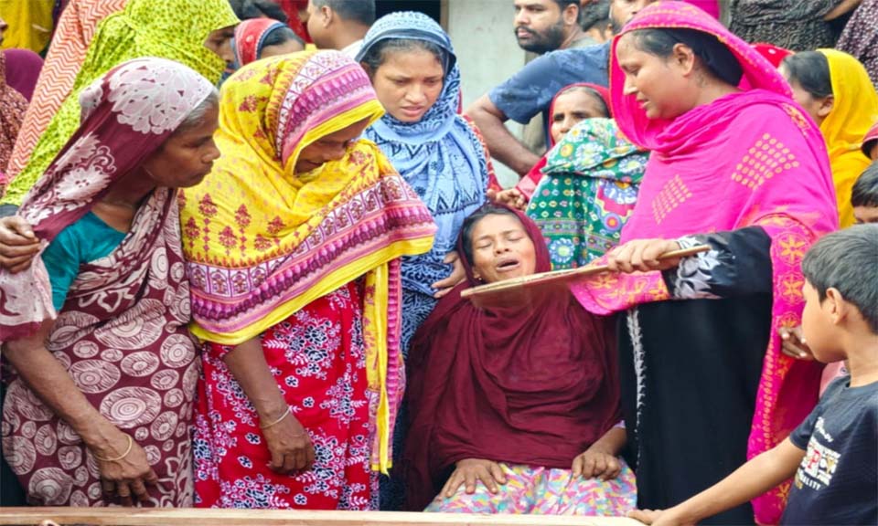 বাড়ির উঠানে কাঠের চৌকি। তার উপরে লাল চাঁদরে ঢাকা রয়েছে সরকারি চাকুরিজীবি জাহিদুল ইসলাম ( ৪৫) ও তার ছেলে জিহাদের (৯) মরদেহ। সেখানে আহাজারি করছেন শিলু খাতুন। তাদের ঘিরে রয়েছেন উৎসুক জনতা ও স্বজনরা। তারা শিলুকে শান্তনা দিচ্ছেন।
