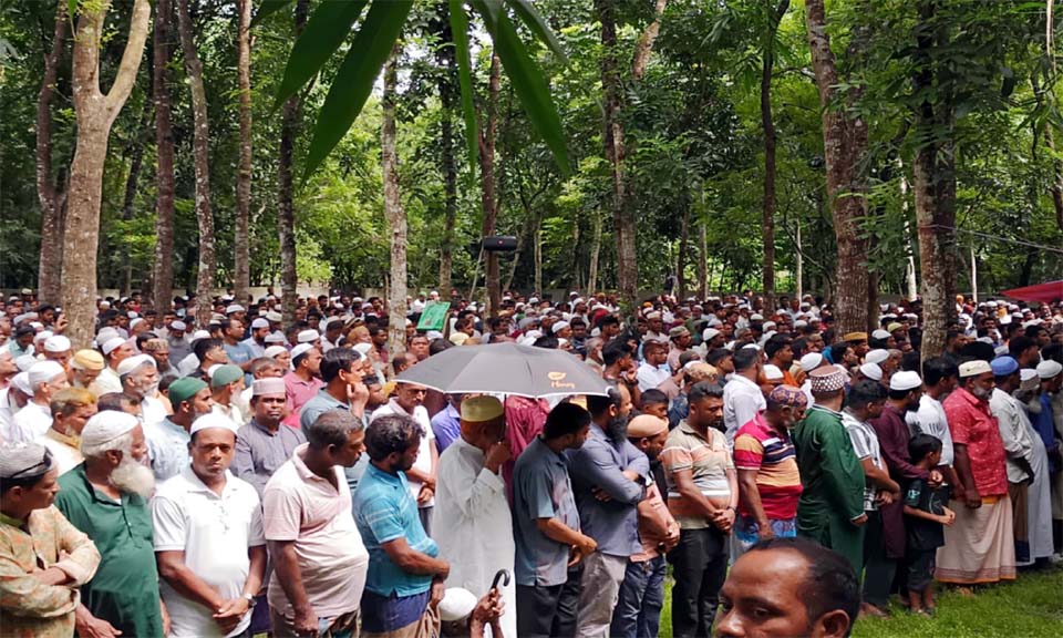 দুর্ঘটনায় নিহত জাহিদুল ইসলামের দুই ছেলে সোহান ও সাগর সিঙ্গাপুর থেকে বৃহস্পতিবার বেলা দশটার দিকে গ্রামের বাড়িতে এসে পৌঁছানোর পর দুপুর ২টার দিকে একসঙ্গে পরিবারের চারজনের নামাজের জানাজা অনুষ্ঠিত হয়।
