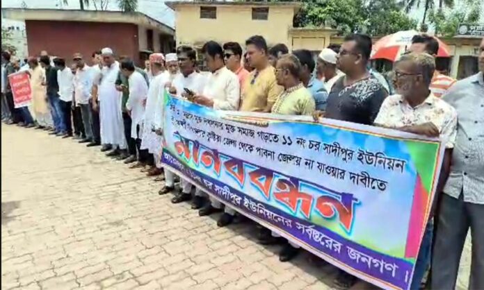 কুষ্টিয়ার কুমারখালী উপজেলার ১১ নম্বর চর সাদীপুর ইউনিয়নকে পাবনা জেলায় সংযুক্ত করার চেষ্টার প্রতিবাদে মানববন্ধন অনুষ্ঠিত হয়েছে।