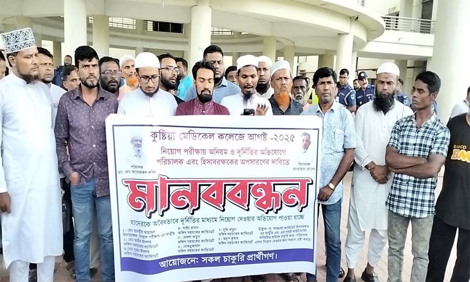 কুষ্টিয়া মেডিকেল কলেজ হাসপাতালে অফিস সহকারী ও কম্পিউটার অপারেটর পদে চাকরি প্রার্থী আব্দুল ওহাব বলেন, শুক্রবারে নিয়োগ পরিক্ষায় অনিয়ম দুর্নীতি করা হয়েছে। পরিচালক আনোয়ারুল কবীর ও হিসাবরক্ষক আনোয়ার টাকার বিনিময়ে নিয়োগ বানিজ্য করেছে। আওয়ামী লীগের আমলে আউটসোর্সিংয়ে নিয়োগ পাওয়া ওয়ার্ড মাস্টার তানভীর সহ বেশ কয়েকজনকে নিয়োগ দেয়ার জন্য পরিচালক উঠে পড়ে লেগেছে। তানভীরসহ আউটসোর্সিংয়ে কর্মরত ৮ জন হিসাবরক্ষকের আত্মীয় স্বজন। পরীক্ষার আগেরদিন দফায় দফায় তাদের সাথে দেখা, সাক্ষাৎ ও মিটিং করেছেন পরিচালক আনোয়ারুল। তারা টাকার বিনিময়ে ব্যাপক অনিয়ম দুর্নীতি করছেন। আমরা তাদের অপসারণ ও দৃষ্টান্তমূলক শাস্তির দাবি জানাচ্ছি। পুনরায় নিয়োগ পরীক্ষার দাবি জানাচ্ছি।
