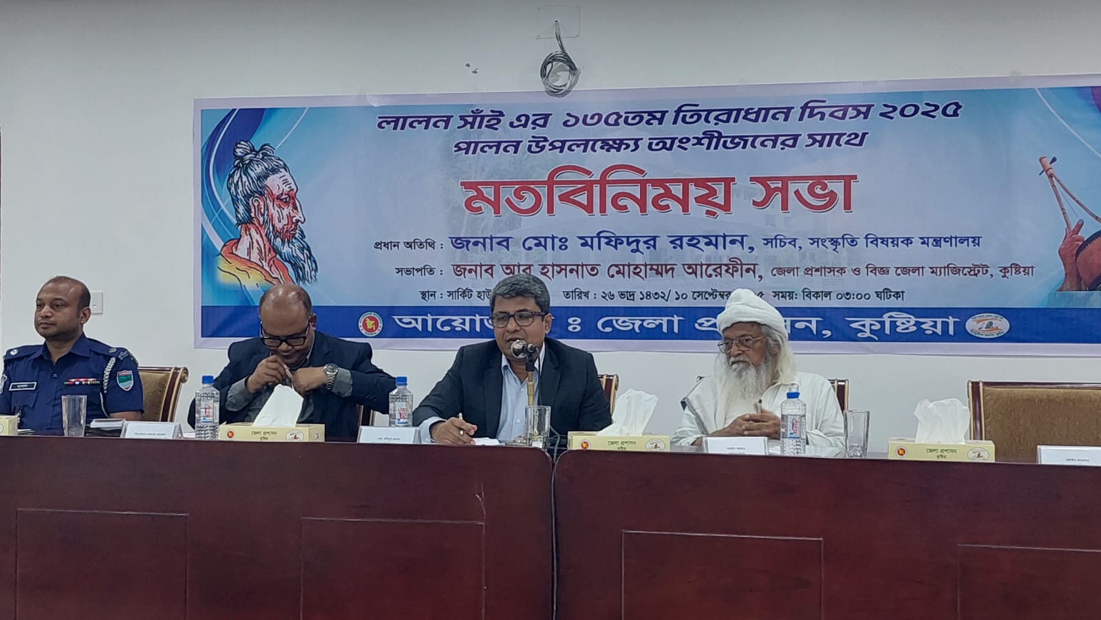 মহাত্মা লালন সাঁইয়ের ১৩৫তম তিরোধান দিবস পালন উপলক্ষে বুধবার বিকালে কুষ্টিয়ার নব নির্মিত সার্কিট হাউজ অডিটোরিয়ামে অংশীজনের সঙ্গে মতবিনিময় সভার আয়োজন করে জেলা প্রশাসন। এতে প্রধান অতিথি ছিলেন সংস্কৃতি বিষয়ক মন্ত্রণালয়ের সচিব মো. মফিদুর রহমান।