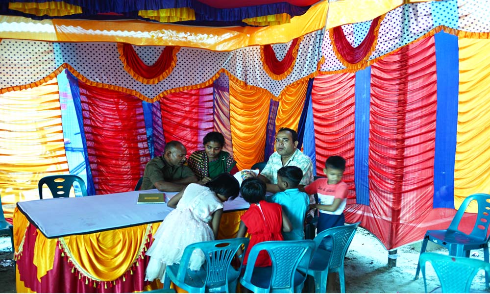 সৌহাদ্য সম্প্রীতির অভার নেই। তাই ব্যস্ততা নেই পূজামন্ডপ পাহাড়ায় থাকা পুলিশ ও আনসার সদস্যদের। অলস সময় পার করছেন তারা। একটি দূর্গাপূজা মন্ডপে নিরাপত্তায় নিয়োজিত পুলিশ ও আনসার সদস্যদের মোবাইলে গেম খেলতে দেখাযাচ্ছে। তাদের সাথে ভাব জমিয়ে মজা লুটছে স্থানীয় শিশুরাও। সোমবার দুপুরে কুষ্টিয়ার খোকসা শিমুলিয়া ইউনিয়নের মানিকাট গ্রামের একটি দূর্গাপূজা মন্ডপ থেকে ছবি তোলা।