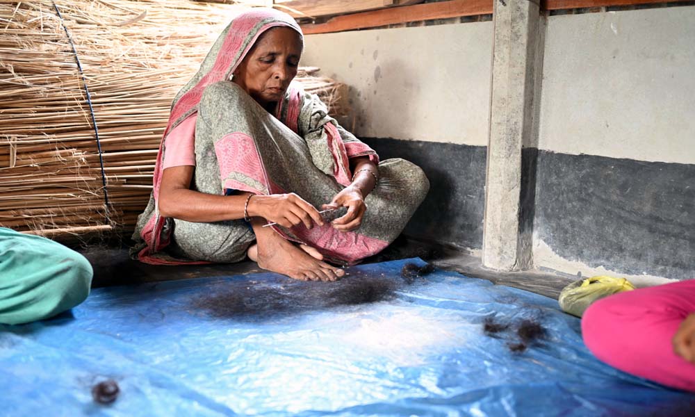 শয্যাশায়ী স্বামীর চিকিৎসা ও খাবার জোঠাতে প্রথমে অন্যের বাড়িতে কাজ করতেন নীলিমা। সেখানে শুধু দুই বেলা দুই মুঠো খাবার জুটলেও ওষুধ কেনা অসম্ভব হয়ে ওঠে। এক পর্যায়ে ৬ মাস আগে এই চুল বাছা কারখানায় কাজ নেন তিনি। এখানে বৃদ্ধার এক নাতীসহ প্রায় ১২ জন নারী শ্রমিক কাজ করেন। তারা সবাই সকাল ৮ টা থেকে দুপুর ২ টা পর্যন্ত কাজ করে হাজিরা পায় ৬০ টাকা।