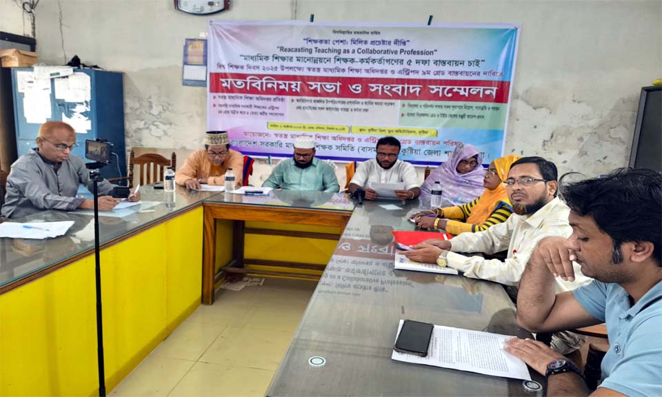 রবিবার কুষ্টিয়া জিলা স্কুলের শিক্ষক কমনরুমে দুপুর সাড়ে ১২টায় স্বতন্ত্র মাধ্যমিক শিক্ষা অধিদপ্তর ও এন্ট্রি পদ নবম গ্রেড বাস্তবায়ন পরিষদ, কুষ্টিয়া জেলা শাখার পক্ষ থেকে এ সংবাদ সম্মেলনের আয়োজন করা হয়।