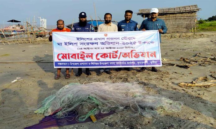 কুষ্টিয়ার কুমারখালীতে মা ইলিশ রক্ষায় পদ্মা নদীতে অভিযানে আটক পাঁচ হাজার মিটার নিষিদ্ধ কারেন্ট জাল পুড়িয়ে দিয়েছে মৎস্য বিভাগ।