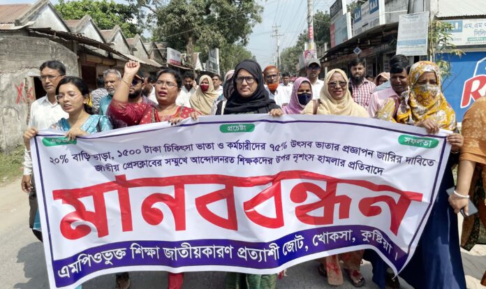 কুষ্টিয়ার খোকসায় বিভিন্ন দাবি আদায়ের লক্ষে এমপিওভুক্ত শিক্ষক ও কর্মচারীরা মানববন্ধন, সমাবেশ ও স্মারকলিপি দিয়েছেন।