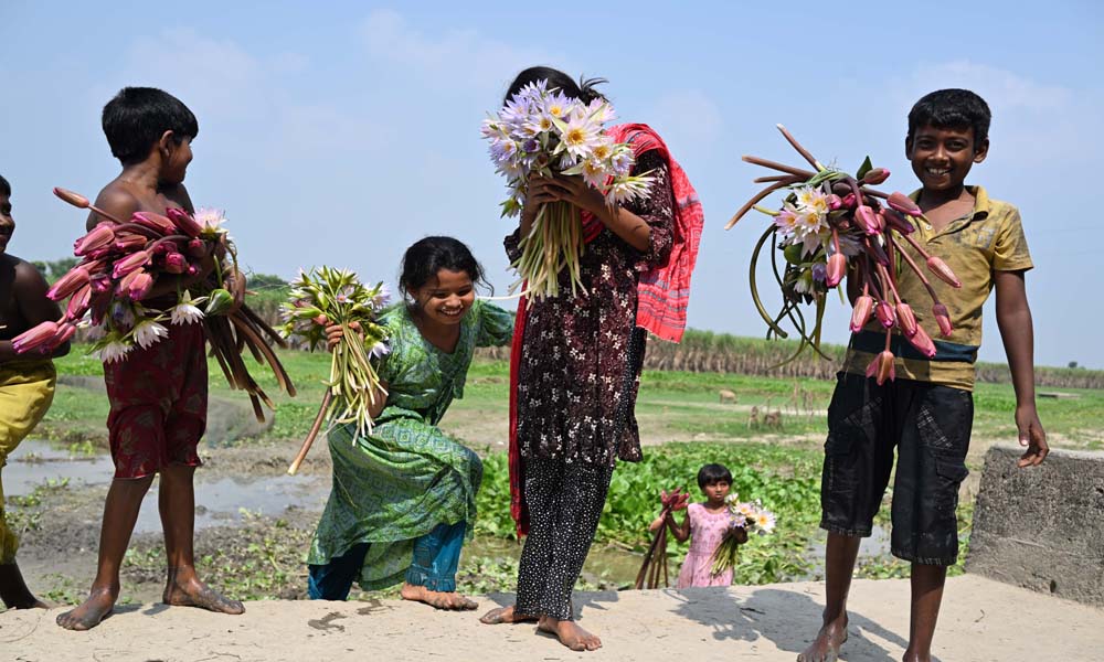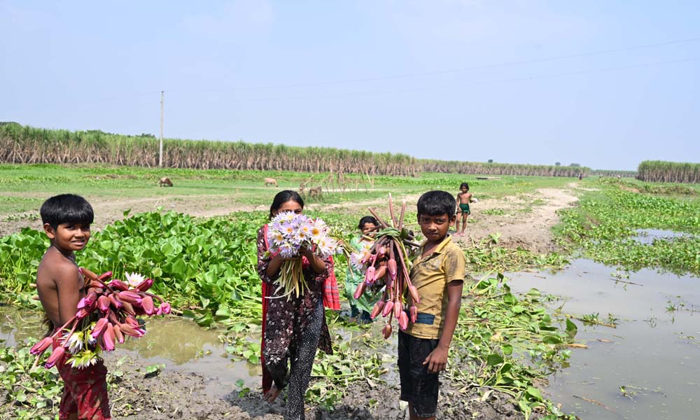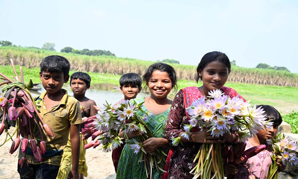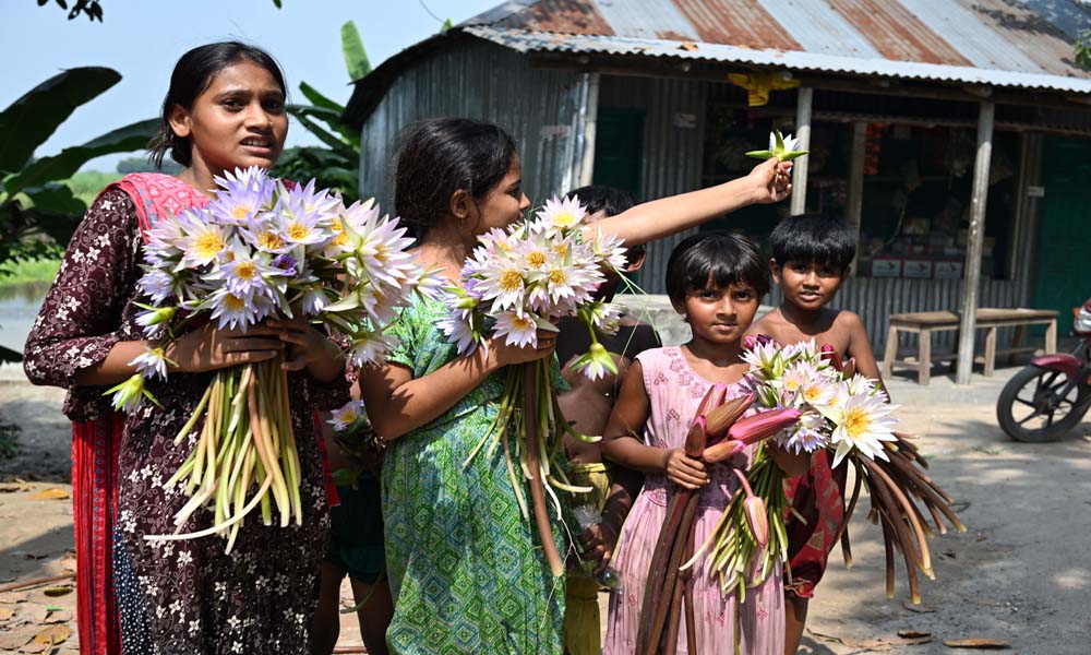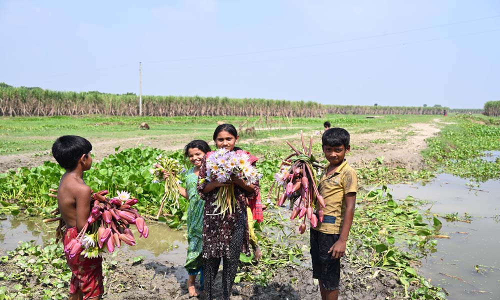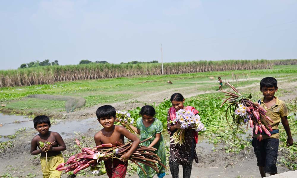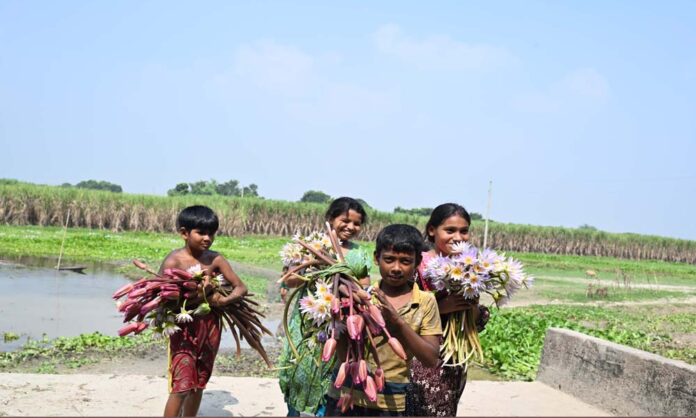 দূরন্ত শিশুরা দল বেঁধে শাপলা কুরিয়ে ঘরে ফিরছে। তাদের (শিশুদের সবার) মুখে শাপলার হাঁসি লেগে আছে। পদ্মা নদীর আমবাড়িয়া – জগন্নাথপুর কোলে জন্মেছে নানা প্রজাতের শাপলা সহ জলজ উদ্ভিদ। খোকসার আমবাড়িয়া ইউনিয়নের আট গাছিয়া পাড়ার কোল থেকে শনিবার দুপুরে ছবিটি তোলা।