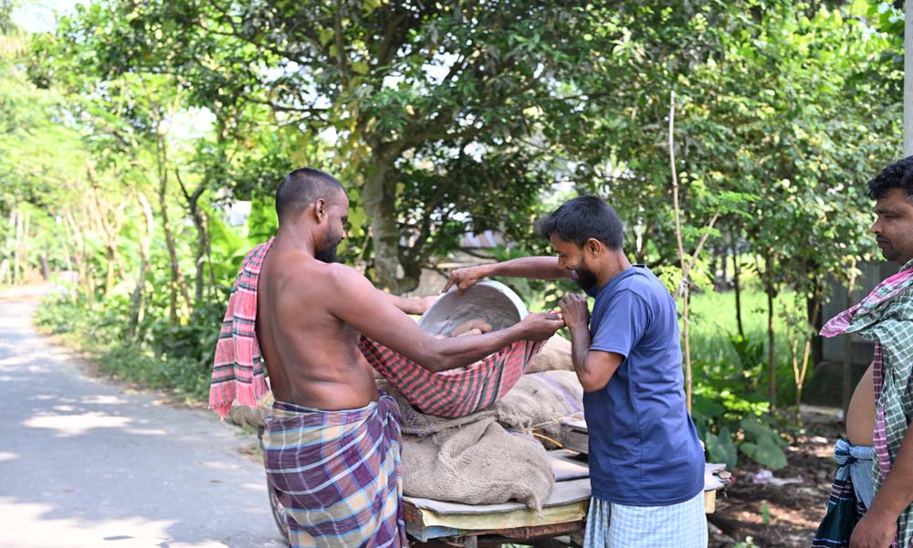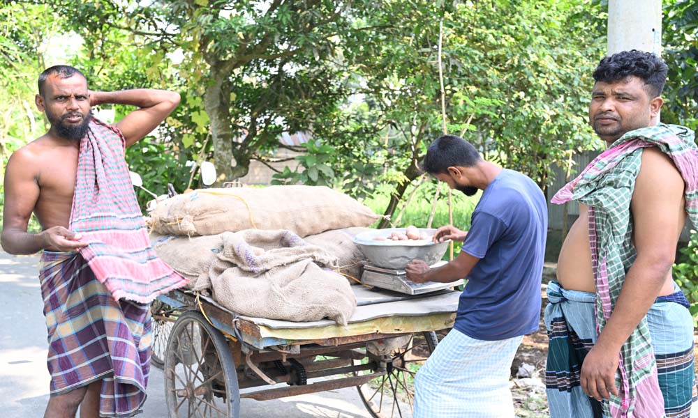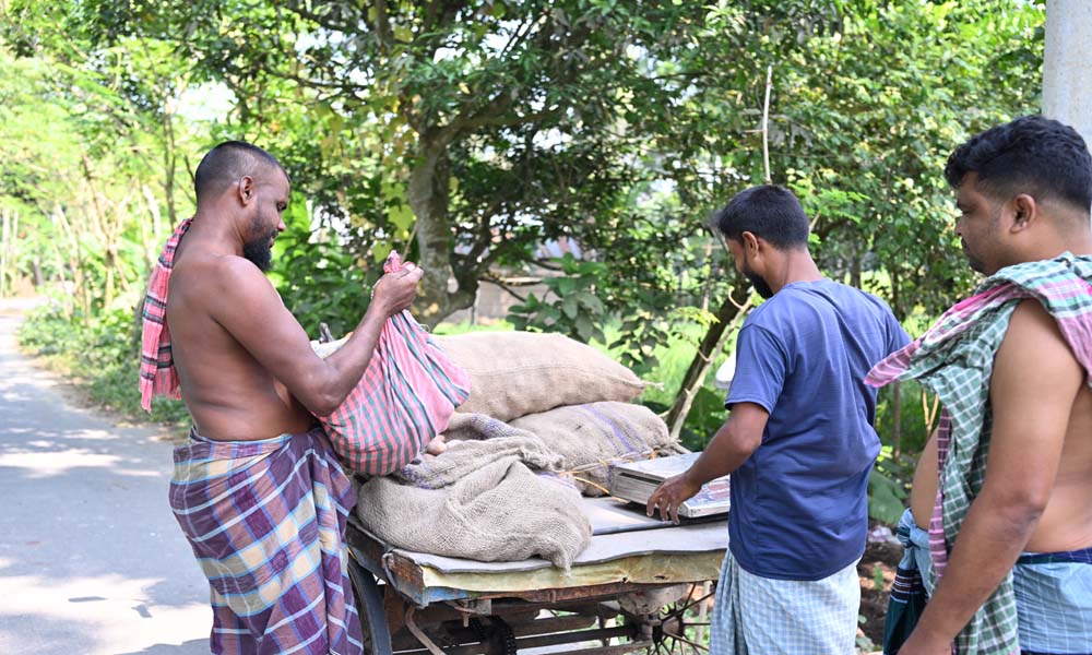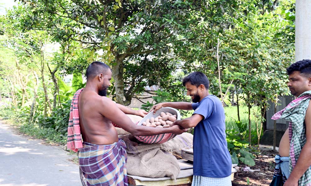 ঘরে বসে হকারের কাছ থেকে ১০০ টাকায় ৬ কেজি আলু কিনে ক্রেতার খুশি হওয়ার কথা। কিন্তু পানির দামে আলু খরিদ করে এই ক্রেতা খুশি নন। কারন তিনি নিজেও একজন কৃষক। তার ভাষ্য আলুর কেজি ৫০ টাকা হওয়া উচিত। তা হলেই কৃষক বাঁচবে। কুষ্টিয়ার খোকসার শোমসপুর ইউনিয়নের ধুসুন্ডা গ্রাম থেকে শনিবার সকালে ছবিটি তোলা।