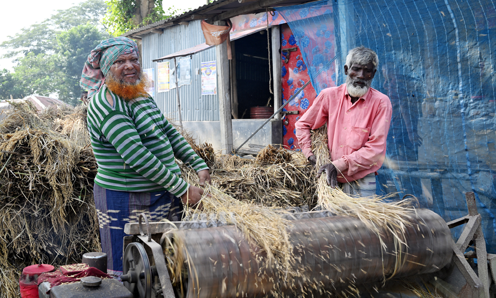 নতুন ধান কাটা শুরু হয়েছে। কৃষকের বাড়ির আঙ্গিনায় ধান মাড়াই করার জায়গা নেই। তাই রাস্তায় ধান মাড়াই করছে। শুক্রবার সকালে কুষ্টিয়ার খোকসার শোমসপুর ইউনিয়নের নিশ্চিন্তবাড়িয়া রেলগেট থেকে ছবিটি তোলা।