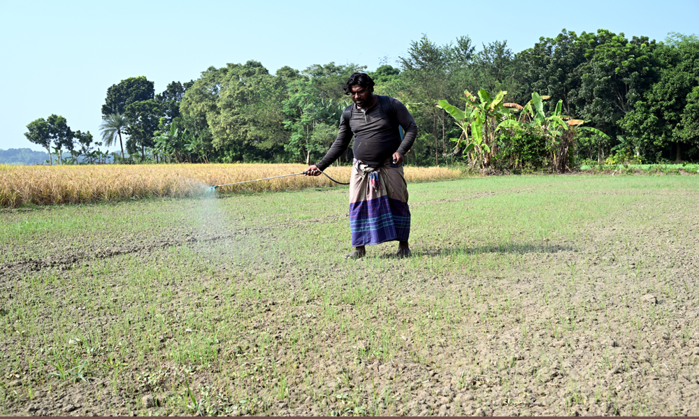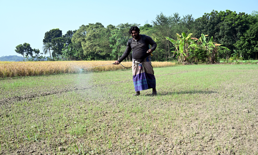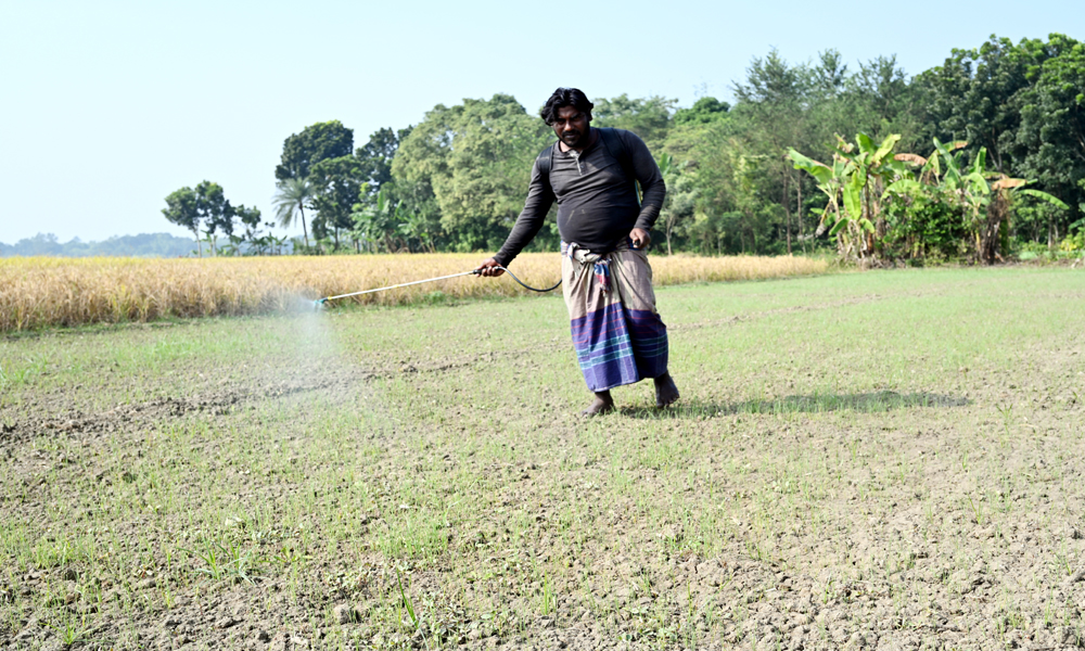পেঁয়াজ আবাদ মৌসূমে জমিতে রোপণের জন্য বীজতলা প্রস্তুত করেছে চাষীরা। হঠাৎ করে পেঁয়াজের বীজতলায় বেড়ে ওঠা চারায় পচন রোগ দেখা দিয়েছে। তাই ছত্রাক নাশক স্প্রে করছেন এক চাষী। মঙ্গলবার দুপুরে বেতবাড়িয়া ইউনিয়নের বনগ্রাম থেকে ছবিটি তোলা।