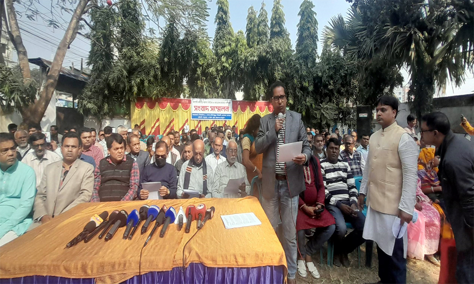 ঝিনাইদহ-২ আসনে বিএনপি’র মনোনয়ন প্রত্যাশী জেলা’র সভাপতি অ্যাডভোকেট এম এ মজিদকে মনোনয়ন দেওয়া দাবিতে সনাতন ধর্মাবলম্বী ভোটাররা সংবাদ সম্মেলন করছেন।