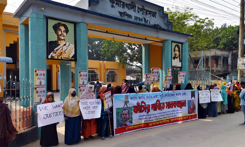 কুষ্টিয়ার কুমারখালী পৌরসভার গাড়িচালক শহিদুল ইসলাম হত্যা মামলার আসামি গ্রেপ্তার ও দৃষ্টান্তমূলক শাস্তির দাবিতে মানবন্ধন অনুষ্ঠিত হয়েছে।