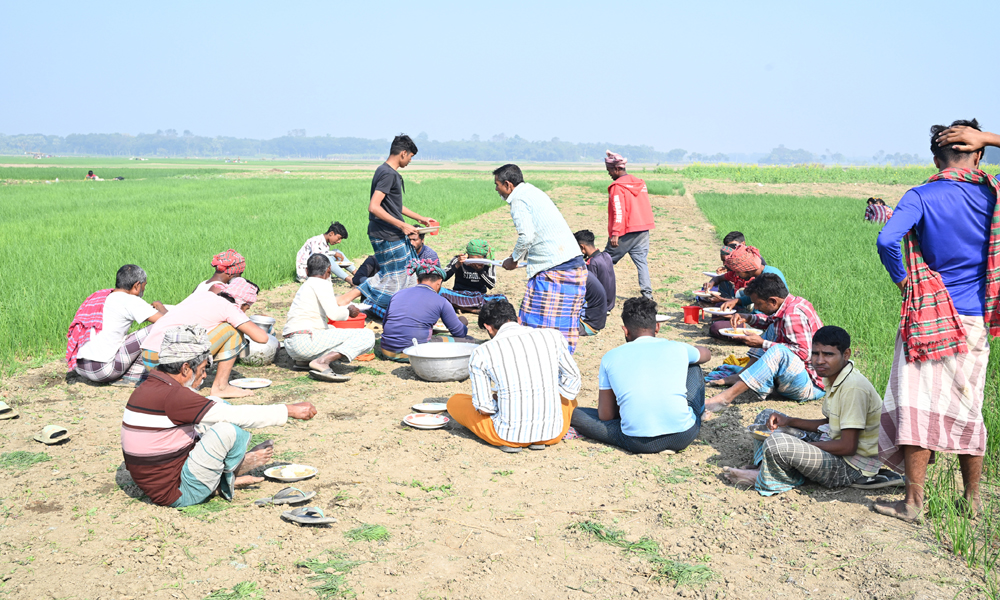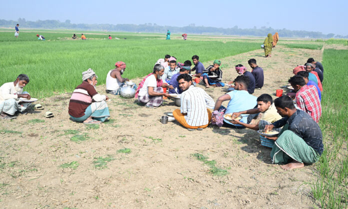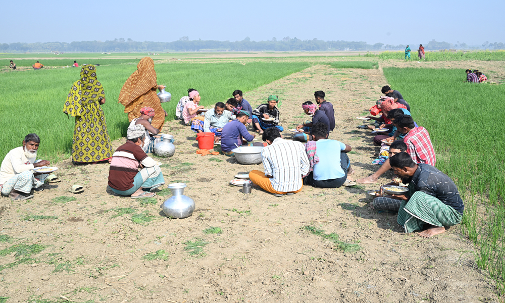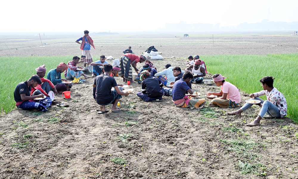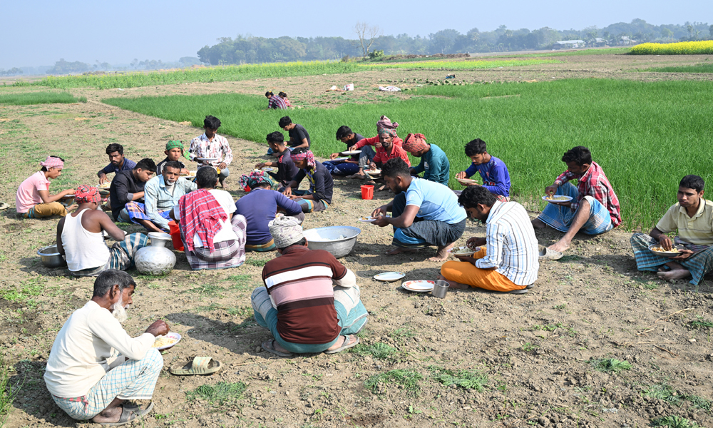 মাঠের এই শ্রমিকদের “জলখাবারে ফুলকো লুচি, ছক্কা আলুরদম, গরম গজা, নরম বুদি, জিলিপি-চমচম” দেওয়া হয়নি। তবে সাদা ভাতের সাথে দেশী সালুন (তরকারি) আছে। দ্বিগন্ত বিস্তৃত খোলা মাঠে শীতের রোদে পিট দিয়ে খেতে বসেছে তারা। প্রতিটি দলে ৩০ থেকে ৫০জন শ্রমিক শীতকালীন পেঁয়াজের চারা লাগানোর কাজ করছে। বুধবার সকালে কুষ্টিয়ার খোকসার বেতবাড়িয়া ইউনিয়নের সোনাপাতিল বিল থেকে ছবিটি তোলা।