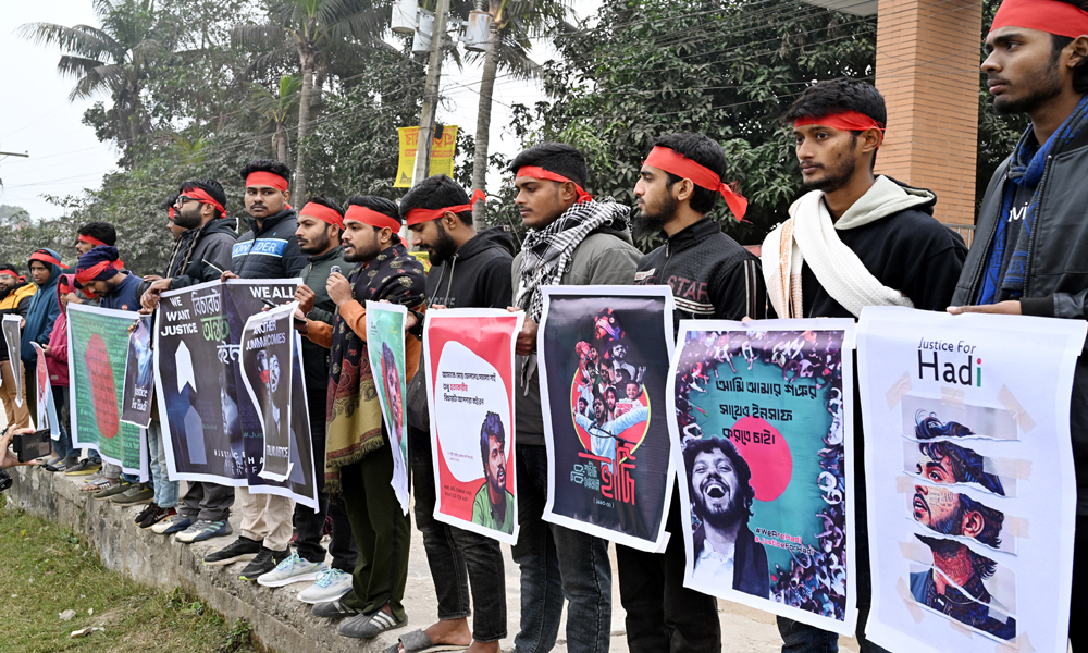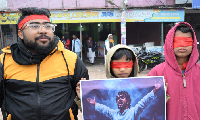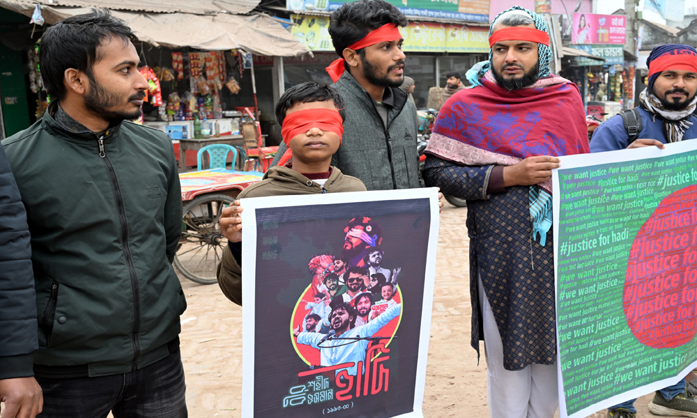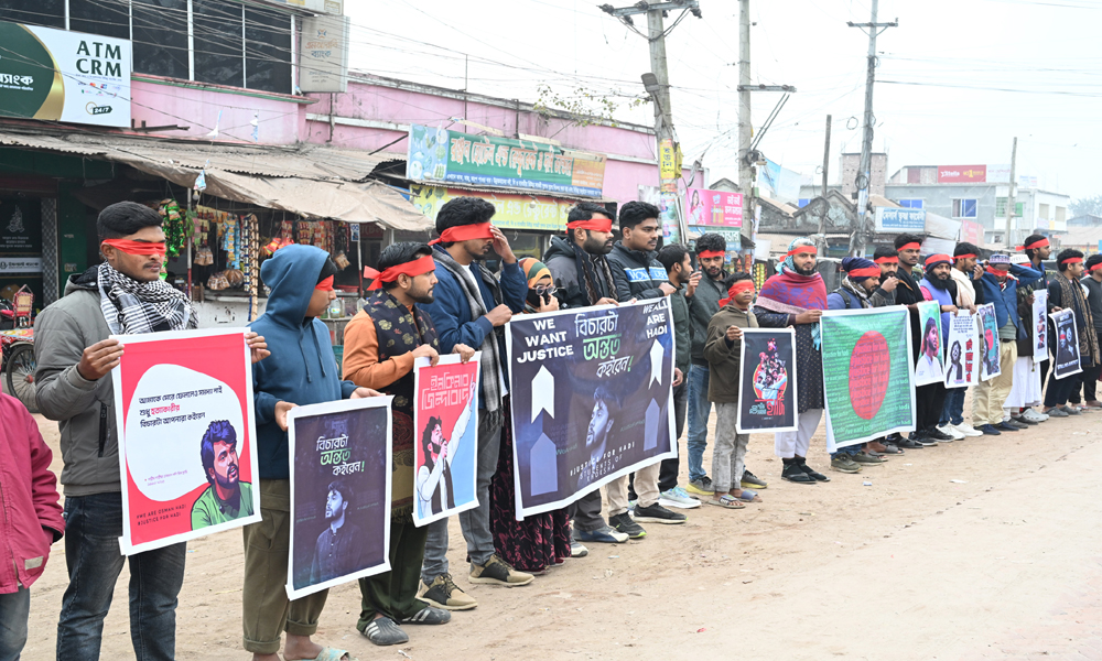 জুলাই যোদ্ধা ইনকিলা মঞ্চের নেতা শরীফ ওসমান হাদীর হত্যা কারীদের দ্রæত আইনে বিচারের আওতায় আনার দাবিতে মানববন্ধন অনুষ্ঠিত হয়। সোমবার বিকালে কুষ্টিয়ার খোকসা থেকে প্রতিবাদ কর্মসূচির ছবিগুলো তোলা হয়।