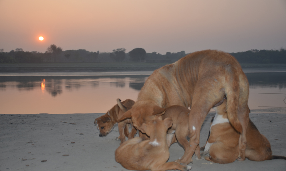 বছরের শেষ স্নিগ্ধ গোধূলীর আলোয় মা কুকুরটি তার ক্ষুধাতুর ছানাদের দুধ পান করিয়ে ক্ষুধা নিবারনে ব্যস্ত। কুষ্টিয়ার খোকসার গড়াই নদীর তীর থেকে বুধবার ছবিটি তোলা।