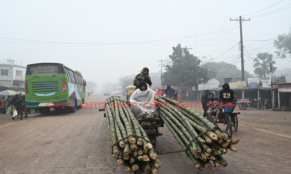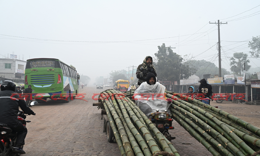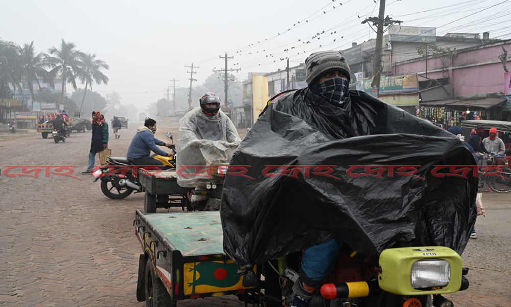 পশ্চিম জনপদে শীত আর ঘন কুয়াশা জেকে বসেছে। কুয়াশা গুড়িগুড়ি বৃষ্টির মত ঝড়ছে। শ্রমজীবীদের কষ্ট বেড়েছে। বৃষ্টির মত কুয়াশা ও শীতল হাওয়া থেকে নিজেকে রক্ষায় এই চালকরা পলিথিনের আবরণে নিজেকে মুড়ে নিয়েছে। শেষ রাতে সবজী নিয়ে কুষ্টিয়া থেকে রাজবাড়ী গিয়েছিলেন এই নছিমন চাকরা। ফিরে যাচ্ছে গন্তব্যে। কুষ্টিয়া- রাজবাড়ী আঞ্চলিক মহাসড়েক খোকসা বাসস্ট্যান্ড থেকে রবিবার সকাল পৌনে ১১ টায় তোলা ছবি। তখন সূর্যের দেখা মেলেনি। ঘন কুয়াশায় আচ্ছন্ন ছিলো প্রকৃতি।