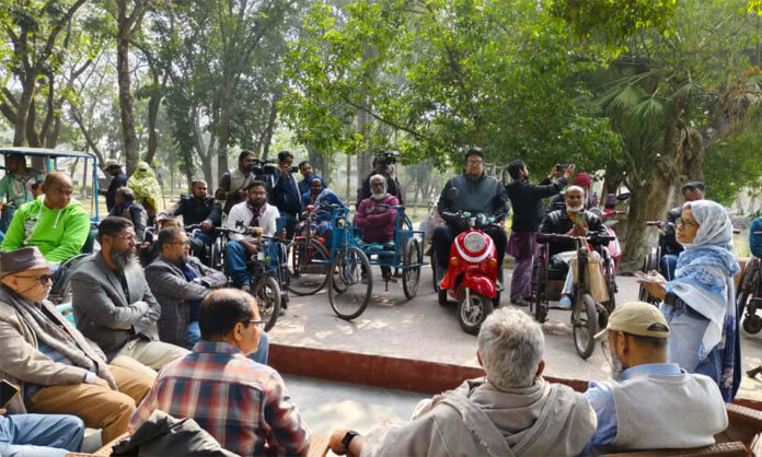 শনিবার শীতের রৌদ্রজ্জ্বল সকালে ব্যাটারিচালিত হুইল চেয়ারে জেলার বিভিন্ন এলাকার অন্তত ১৭ জন স্পাইনাল কর্ড ইনজুরিতে আক্রান্ত প্রতিবন্ধী স্বাবলম্বী হওয়ার স্বপ্নের আড্ডায় যোগদেন। তাদের কারো দুই পা, কারো এক পা আবার কারো পা থাকলেও নেই হাটাচলার শক্তি। তবুও চোখেমুখে হাসি আর সাহসিকতার প্রতিচ্ছবি।