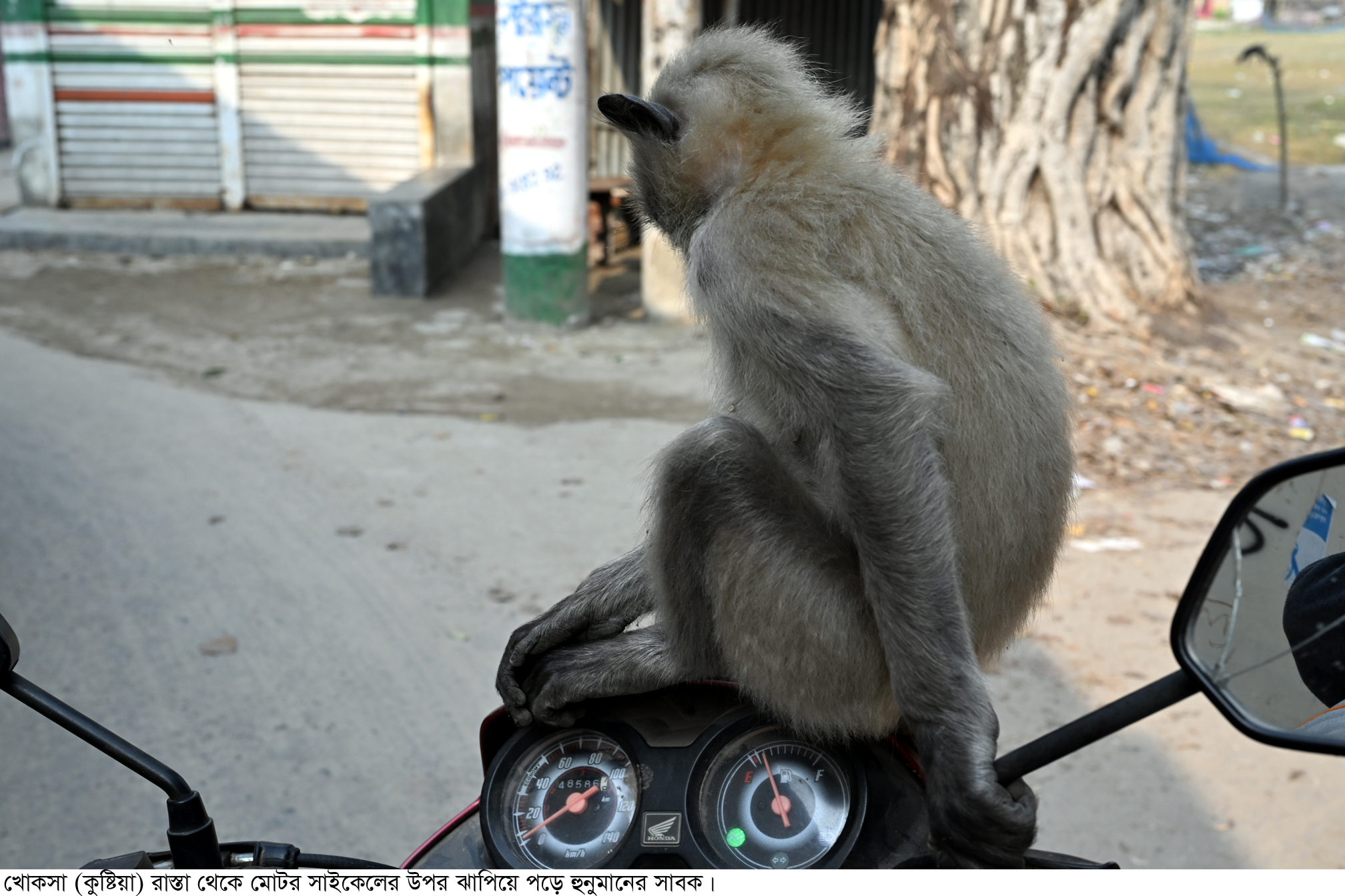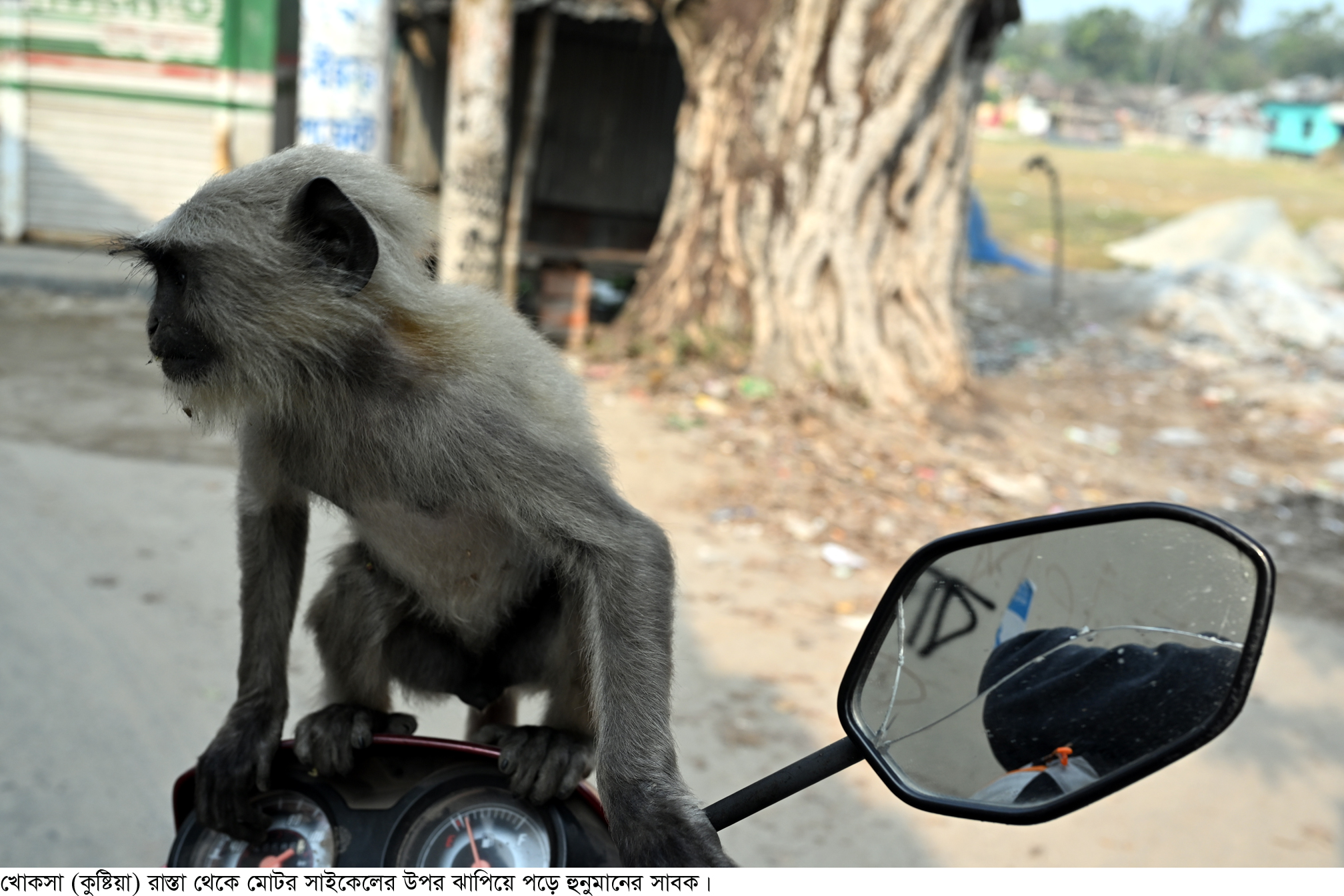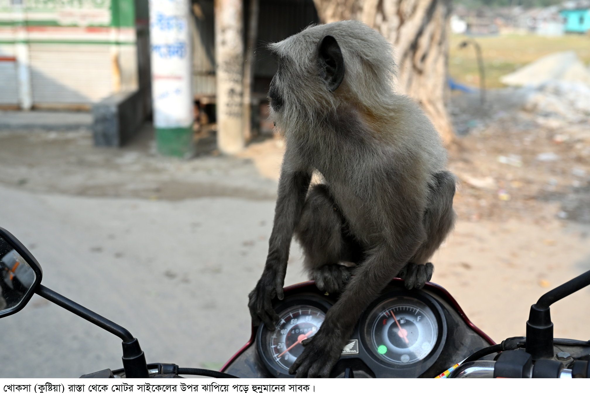 চরম খাদ্য সংকটে আছে দল ছুট সাবকসহ কালোমুখি হনুমানটি। খাদ্যের সন্ধ্যানে বসতবাড়ি থেকে হাট বাজার দাপিয়ে বেড়াচ্ছে তারা। কয়েক মাস বয়সের সাবকটি মানুষের কাছে দৌড়ে যাচ্ছে। কখনো সখনো জীবনের ঝুকি দিয়ে যানবাহনের দিকে তেড়ে যাচ্ছে। মা হনুমানটি পথচারীর কাছ থেকে খাবার নিতে ব্যস্ত। বৃহস্পতিার দুপুরের আমাদের প্রতিনিধির চলন্ত মোটর সাইকেল উপর ঝাপিয়ে পরে হনুমান সাবকটি। মুহুত্যের মধ্যে পালিয়েও যায়।
