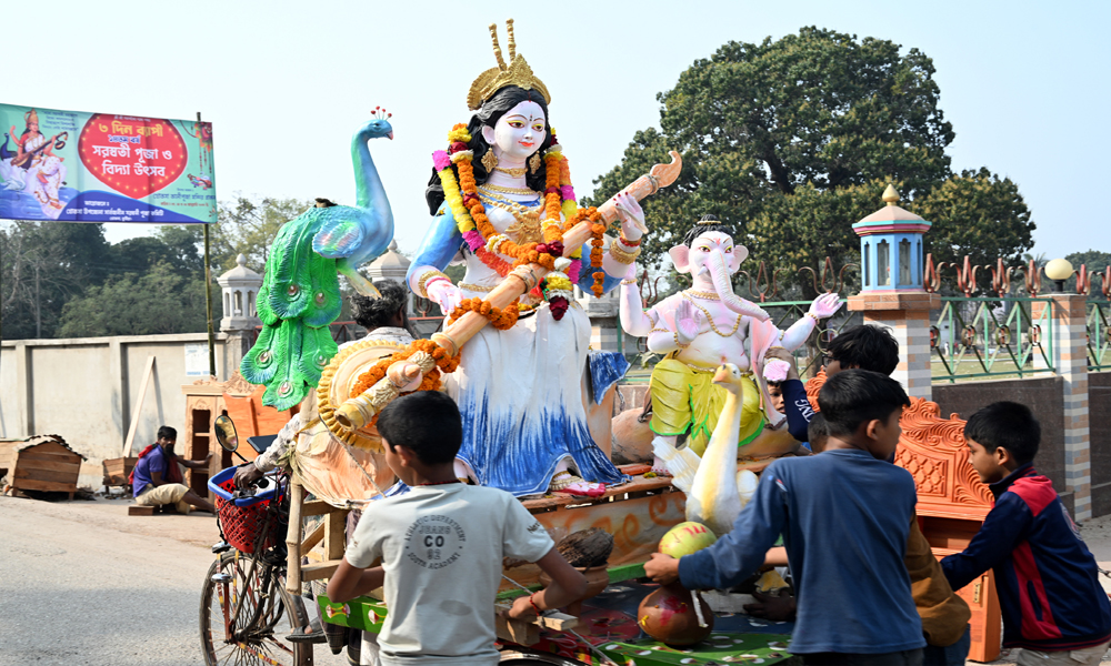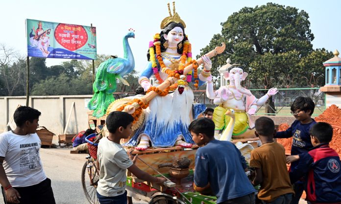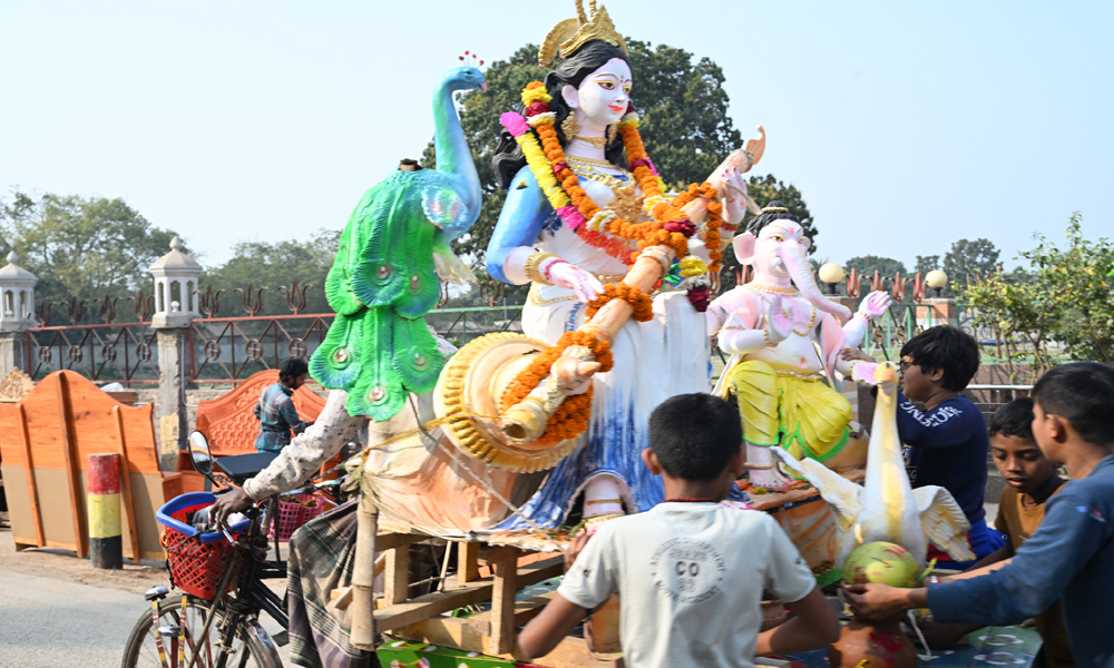 বিদ্যার দেবী সরস্বতী পূজার আনুষ্ঠানিকতা শেষ হয়েছে। প্রতিমা বিসর্জন শুরু হয়েছে। রিকসা ভ্যানে করে গড়াই নদীতে বিসর্জনের জন্য প্রতিমা নেওয়া হচ্ছে। কুষ্টিয়ার খোকসা উপজেলা কেন্দ্রিয় সরস্বতী পূজা কমিটির প্রতিমা বিসর্জনের প্রস্তুতির ছবিটি সোমবার দুপুরে তোলা।