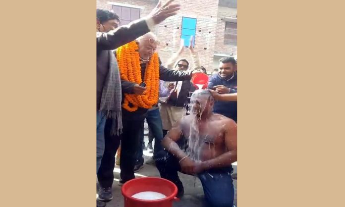 ধানের শীষের মনোনীত প্রার্থী আলহাজ্ব রেজা আহম্মেদ বাচ্চু মোল্লা ও উপজেলা বিএনপির সাবেক সাধারণ সম্পাদক শহীদ সরকার মঙ্গল একটি বালতিতে থাকা দুধ তার মাথায় ঢেলে দেন।