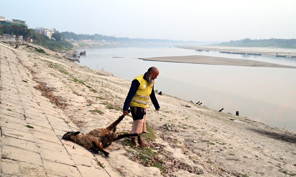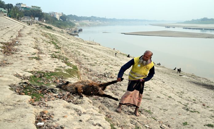 মরা জীব-জন্তুর মৃতদেহ থেকে শুরু করে ঘর গৃহস্থালীর উচ্ছিষ্ট ফেলা হচ্ছে মৃত প্রায় গড়াই নদীতে। ফলে নদী পানি ও পরিবেশ দূষিত হচ্ছে। শুক্রবার বিকালে কুষ্টিয়ার খোকসার কালীবাড়ি ঘাটে মৃতপশু ফেলার ছবিটি তোলা।