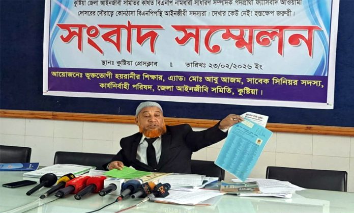 রবিবার বেলা ১টায় কুষ্টিয়া প্রেসক্লাবে সংবাদ সম্মেলনে এ অভিযোগ করেন জেলার জ্যেষ্ঠ আইনজীবী আবু আজম।