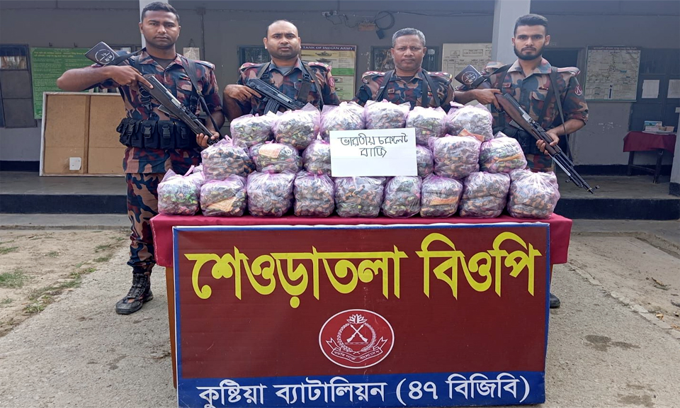 বিজ্ঞপ্তিতে জানানো হয়, সুনির্দিষ্ট গোয়েন্দা তথ্যের ভিত্তিতে মঙ্গলবার সকাল ৭টার সময় কুষ্টিয়া ব্যাটালিয়নের অধীনস্থ শেওড়াতলা মাঠে বিশেষ অভিযান চালিয়ে পরিত্যক্ত অবস্থায় কয়েকটি বস্তা তল্লাশি করে ভারতীয় ১৭ হাজার ২৫০ পিস চকলেট বাজি উদ্ধার করা হয়। উদ্ধারকৃত এসব চকলেট বাজির আনুমানিক মূল্য ৪ লাখ ৩১ হাজার ২৫০ টাকা।