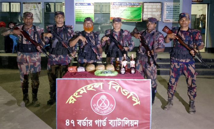 এরআগে, রবিবার (০৮ মার্চ) সন্ধ্যা সাড়ে ৬টার সময় রংমহল মাঠ এলাকায় অভিযান চালিয়ে মালিকবিহীন অবস্থায় ভারতীয় ৩ কেজি গাঁজা, ৫ বোতল মদ, ১ হাজার পিস ডেক্সামেথাসন ট্যাবলেট, ১ হাজার পিস সিপ্রোহেপ্টাডিন ট্যাবলেট এবং ৮৮ পিস চকলেট বাজি উদ্ধার করা হয়।