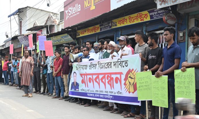 নির্যাতিত ব্যবসায়ী মাহাফুজুর রহমান বর্ষন এ মানববন্ধন চলাকালে তার ওপর ওসি মোতালেব যে মানষিক নির্যাতন করেছে তার বর্ণনা তুলে ধরেন। তিনি বলেন, ২৭ ফেব্রæয়ারি রাতে নিজের জীবনের নিরাপত্তা চেয়ে পুলিশ সুপার বরাবর আবেদন করেন। আবেদনের প্রেক্ষিতে তিন সদস্যের তদন্ত কমিটির গঠন করা হয়। এ কমিটির সদস্য একজন এএসপি তাকে আবার হুমকী দিয়েছেন। “পুলিশের বিরুদ্ধে অভিযোগে পরিণতি কত ভয়াবহ হয় তা তাকে হাড়ে হাড়েটের পেতে হবে” বলেও জানিয়েছেন বলে বর্ষন দাবি করেন। বক্তব্যে বর্ষন এখনো নিরাপদ নয় বলে জানান। একজন এডিশনাল এসপি (আলফা টু পরিচয়ের) পুলিশ কর্মকর্তা ব্যবসায়ী বর্ষনকে হুমকী দিয়েছে বলে অভিযোগ করেন।