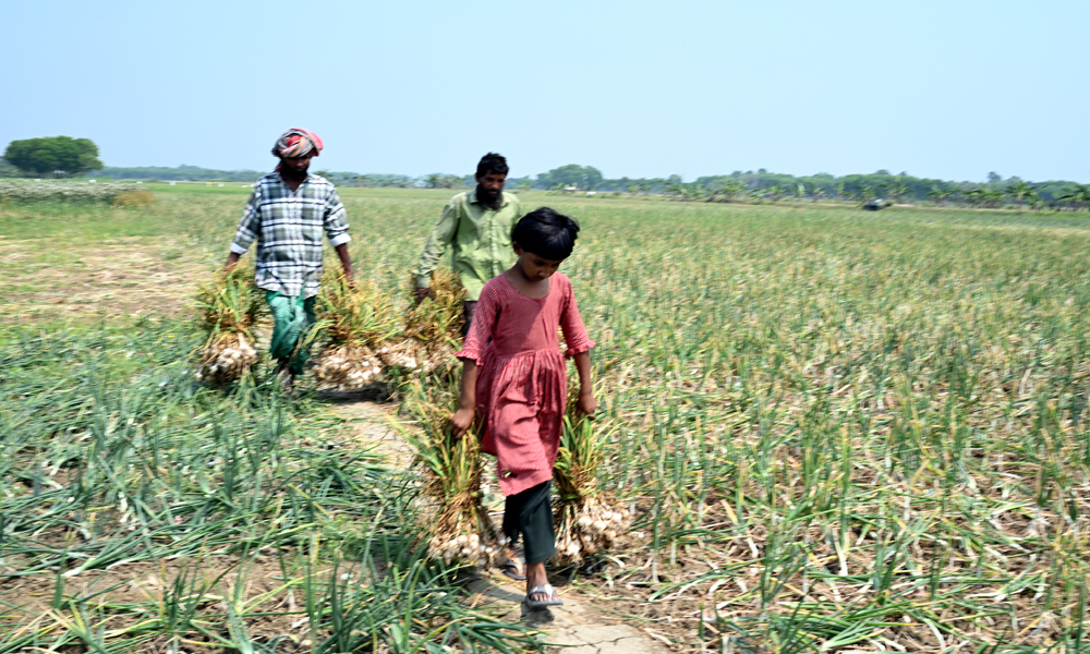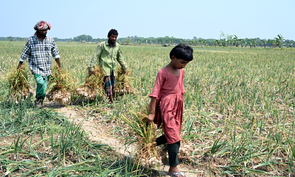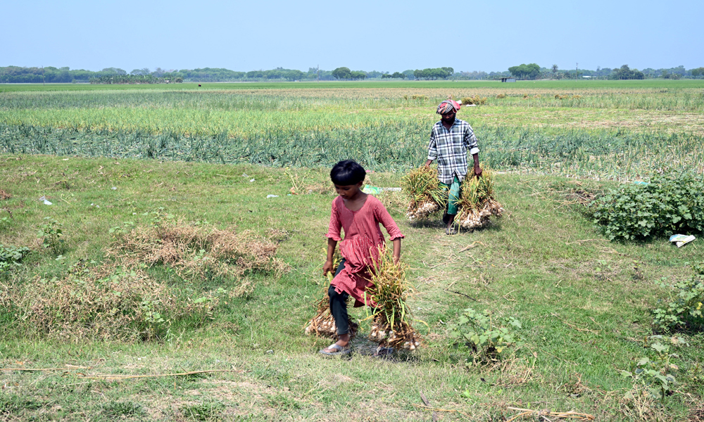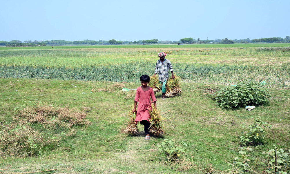 মিথিলা। তৃতীয় শ্রেণিতে পড়ে। ক্ষেত থেকে রসুন তুলে বিক্রি করে তবেই তাদের ঈদে নতুন জামা কেনা হবে। তাই বাবার সাথে জমি থেকে রসুন তুলে টেনে রাস্তায় আনছে। পাখি ভ্যানে বাড়ি নেওয়া হবে। একদিন বাদে ঈদ। মিথিলার জামা হবে তো? বুধবার দুপুরে খোকসার রতনপুর বিল থেকে ছবিটি তোলা। শিশু মিথালাদের বাড়ি কুমারখালী উপজেলার সোদকী মহম্মদ পুর গ্রামে। সে মন্টু শেখের মেয়ে।