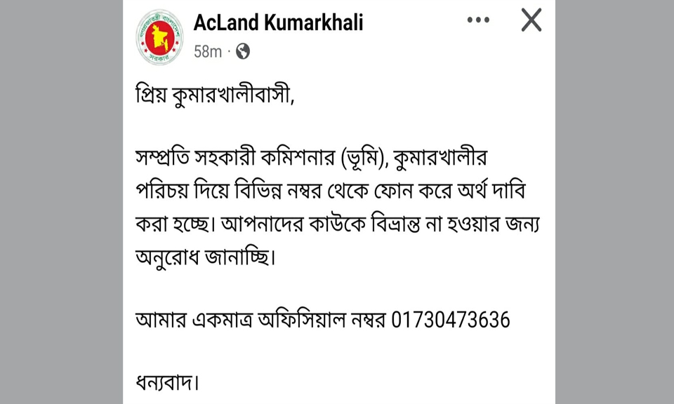 ফেসবুক স্ট্যাটাসে বলা হয়েছে যে ‘ প্রিয় কুমারখালীবাসী। সম্প্রতি সহকারী কমিশনার (ভূমি), কুমারখালীর পরিচয় দিয়ে বিভিন্ন নম্বর থেকে ফোন করে অর্থ দাবি করা হচ্ছে। আপনাদের কাউকে বিভ্রান্ত না হওয়ার জন্য অনুরোধ জানাচ্ছি। আমার একমাত্র অফিসিয়াল নম্বর ০১৭৩০৪৭৩৬৩৬। ধন্যবাদ।’