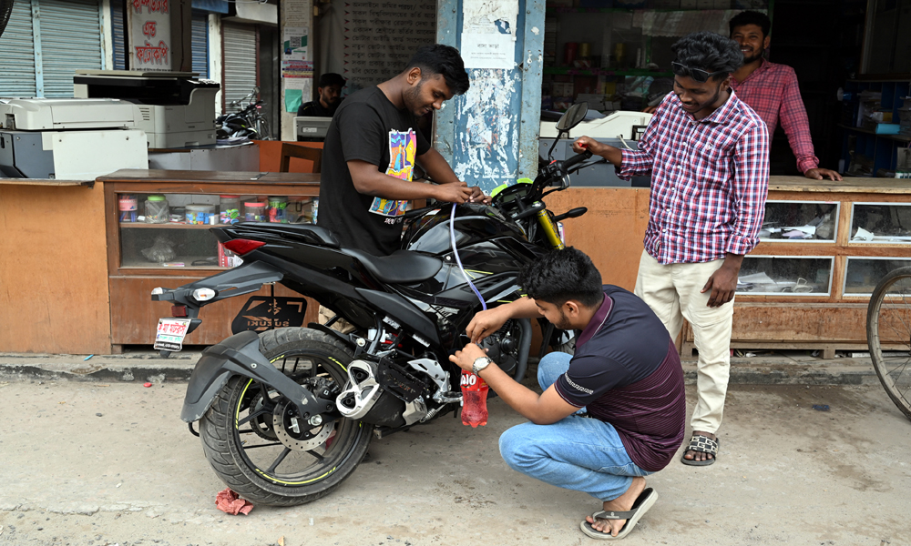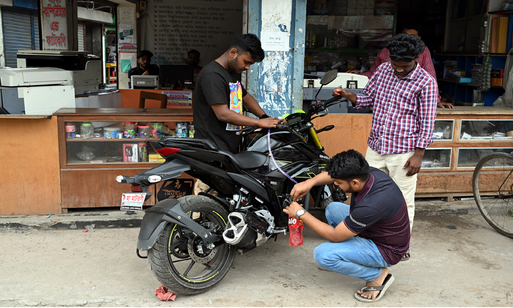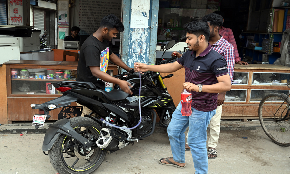 পেট্রোল পাম্পে দীর্ঘ লাইনে অপেক্ষার পর ৩০০ শ টাকার পেট্রোল পেয়েছেন। কিন্তু অন্য বন্ধুর মোটরসাইকেলে তেল নাই। গত দুইদিন ঘরে পরে আছে। তাই নিজের গাড়ির ট্যাঙ্কি থেকে পাইপ দিয়ে বোতল ভরে তেল দিয়ে বন্ধুত্ব রক্ষা করছেন। অথচ প্রতিদিন সকাল থেকে গভীর রাত পর্যন্ত খোকসা উপজেলার দু’টি পাম্প থেকে গড়ে ৪/৫ হাজার লিটার পেট্রোল অকটের সরবরাহ করা হচ্ছে। কিন্তু সংকট যাচ্ছেনা। সকাল হলেই তেল পাম্পের সামনে হাজারো মোটরসাইকেলের উপস্থিতি চোখে পরে। শনিবার দুপুরে খোকসার প্রধান বাজার থেকে ছবি তোলা।