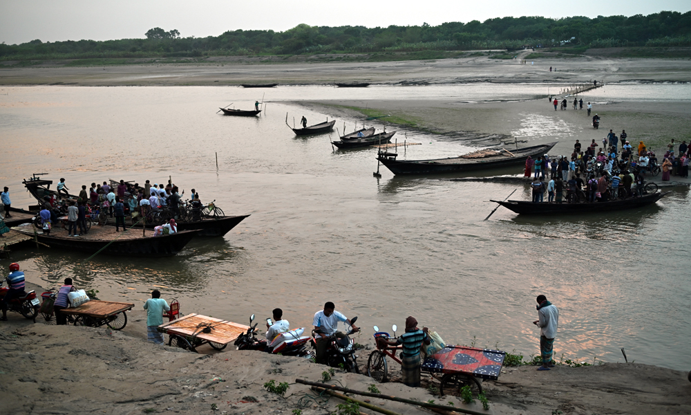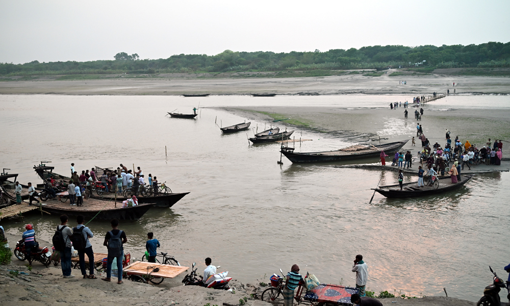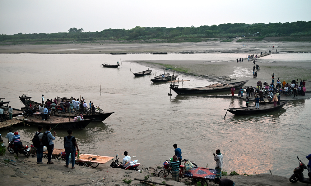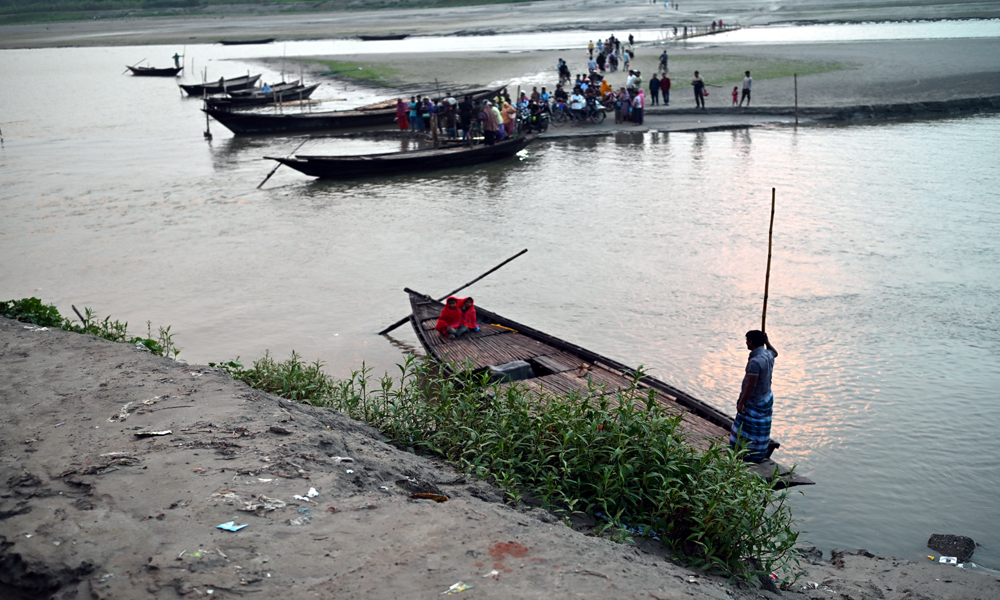 নদীতে চর যেগে ওঠায় কয়েক সপ্তাহ আগেই খেয়া ঘাটে নৌকা পারা বন্ধ হয়ে যায়। গড়াই নদীতে বাঁশের চরাট দিয়ে যাত্রী পারপার হচ্ছিলো। কিন্তু রবিবার বিকালে বৃষ্টির পর নদীতে পানি বৃদ্ধি পাওয়ায় বাঁশের চরাট ডুবে যায়। সাময়িক বন্ধ হয়ে যায় পারাপার। দুই পারেই যাত্রীদের অপেক্ষা করতে দেখা যায়। গড়াই নদীর খোকসা -ওসমানপুর খেয়া ঘাট থেতে রবিবার সন্ধ্যায় তোলা ছবি।