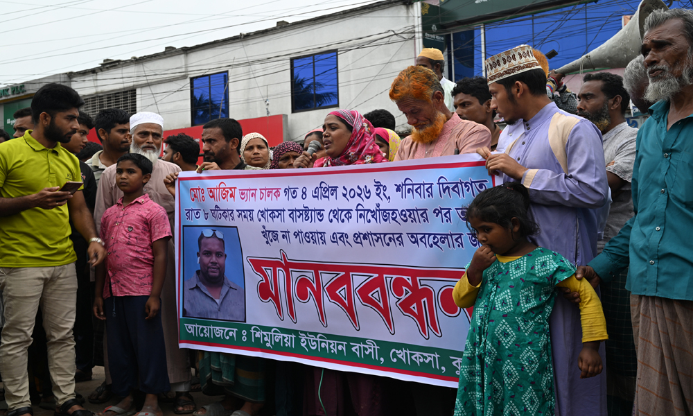 বৃহস্পতিবার সকালে কুষ্টিয়ার খোকসা বাস স্ট্যান্ডে নিখোঁজ ভ্যান চালক আজিম (৩৫) কে উদ্ধারের দাবিতে মানববন্ধন করে নিখোঁজের পরিবার ও গ্রামবাসী। সকাল ১০ টায় মানববন্ধন শুরু হয়। এতে কয়েকশ নারী পুরুষ অংশ গ্রহন করেন। পরে মানববন্ধনকারীরা বিক্ষোভ মিছিলসহ থানা ও উপজেলা পরিষদে গিয়ে কর্মকর্তাদের সাথে দেখা করার চেষ্টা করেন। কর্মকর্তারা না থাকায় বিক্ষোভকারীরা ফিরে যায়। মানববন্ধন চলাকালে কুষ্টিয়া-রাজবাড়ী আঞ্চলিক মহাসড়কে এক কিলোমিটার জুড়ে যাত্রী ও পন্যবাহী গাড়ির জাম সৃষ্টি হয়। যাত্রীরা ভোগান্তির শিকার হয়।